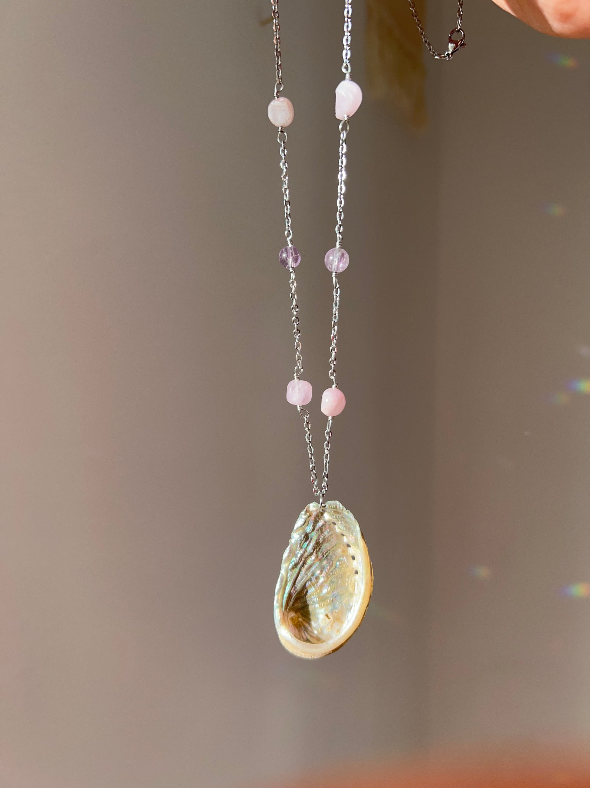 Collana realizzata a mano, in 100% acciaio inox, con pendente di Abalone, e pietre di Ametista Lavanda + Kunzite