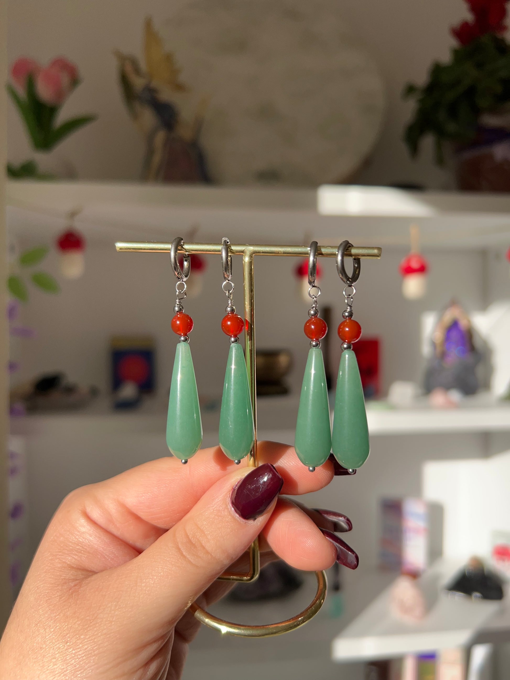 Orecchini con Corniola e Avventurina Verde, realizzati a mano in acciaio inossidabile (1 COPPIA)