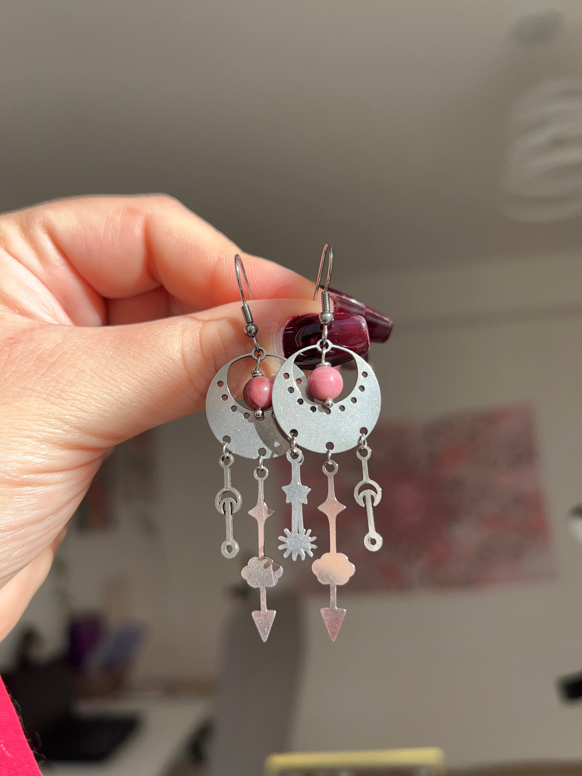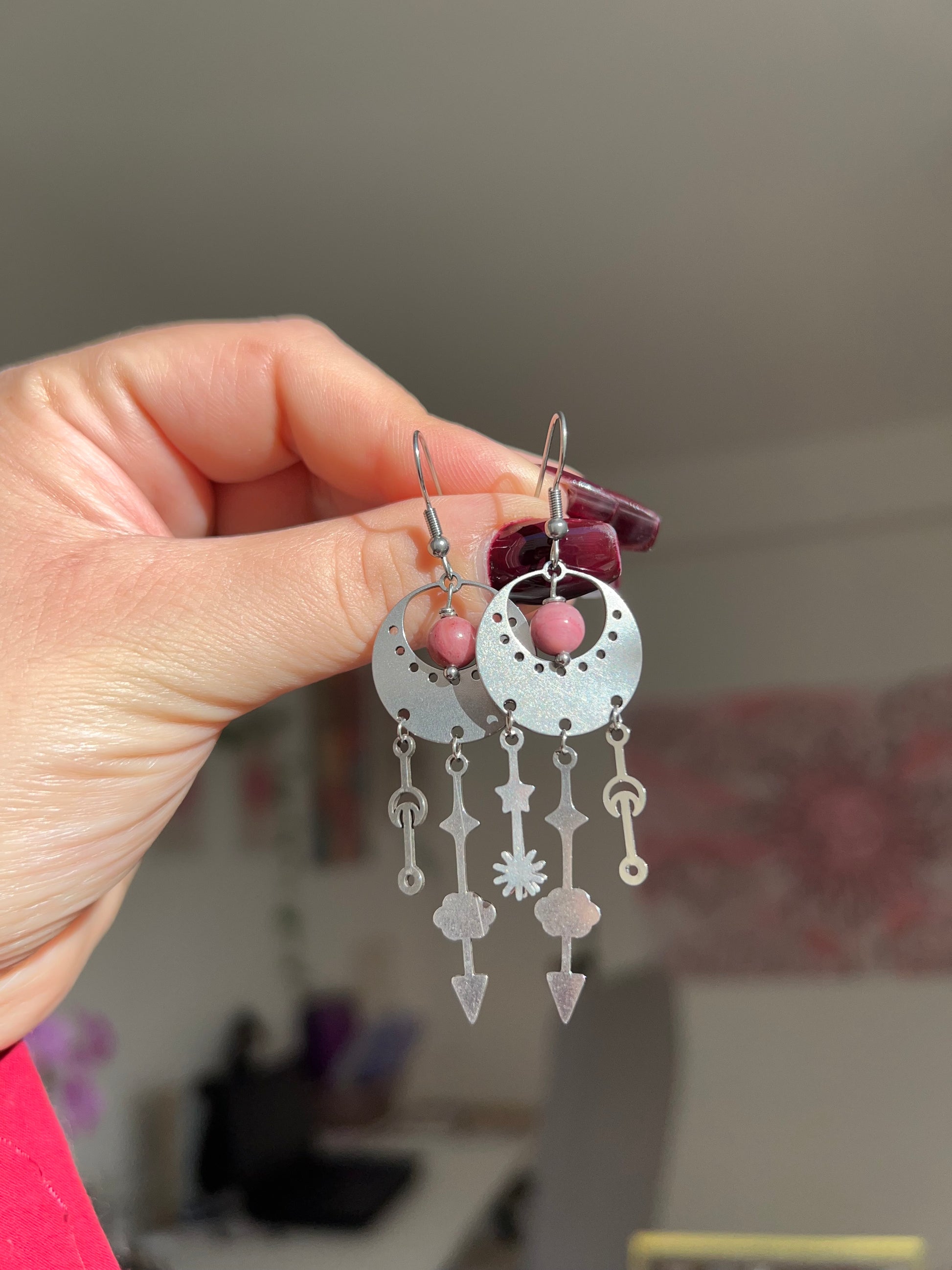 Orecchini con Rodonite, realizzati a mano in acciaio inossidabile